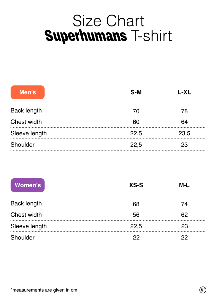 Please note: T-shirt sizes follow a flexible sizing chart.